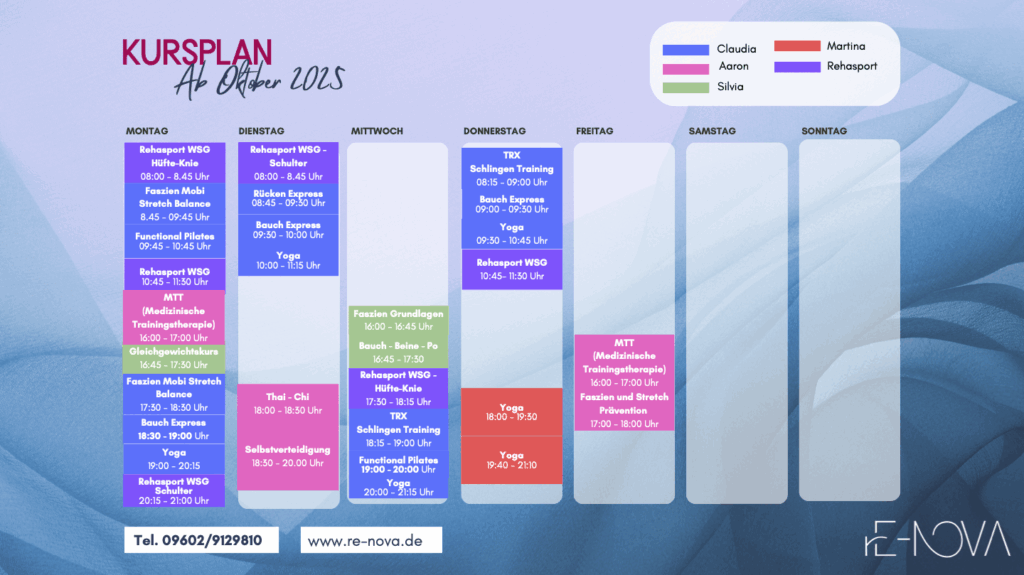 Ob du dich auspowern, entspannen oder gesundheitsorientiert bewegen willst – unser Kursplan bietet dir alles: Von Yoga, Pilates und Selbstverteidigung bis hin zu zertifizierten Reha-Kursen.