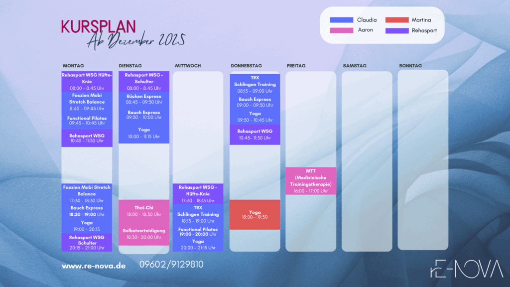 Ob du dich auspowern, entspannen oder gesundheitsorientiert bewegen willst – unser Kursplan bietet dir alles: Von Yoga, Pilates und Selbstverteidigung bis hin zu zertifizierten Reha-Kursen.